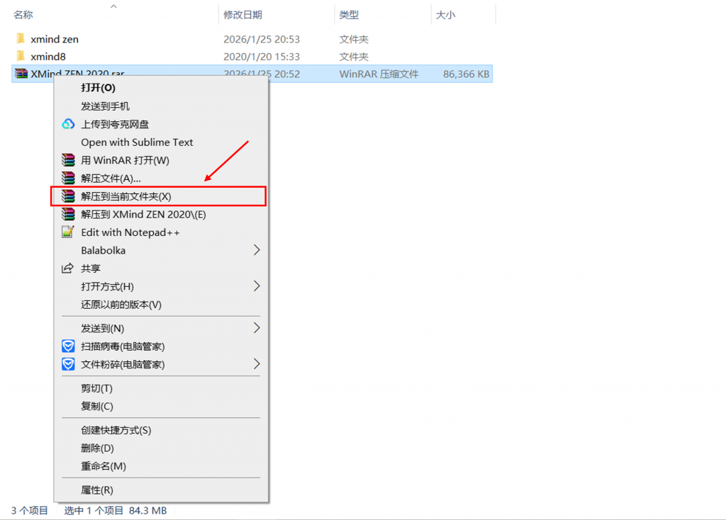 1、下载Xmind zen安装包后,放到要安装的文件目录,右键解压到当前文件夹。